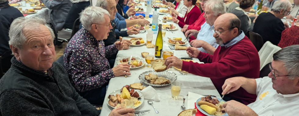 La ChouGaSou pour Choucroute, Galette des rois et Soupe. La journée débute à midi jusqu'au soir 23h00. Après le verre de bienvenue, nous commençons par la traditionnelle choucroute, suit la galette des rois dans l'après midi et pour bien terminer cette journée, la soupe à l'oignon. 75 membres du club ou amis du club ont répondu présent. Il y a eu de la danse, un quiz musical et notre célère karaoké où plusieurs membres du club se sont surpassés. Les rois et reines de la journée ont été chaleureusement sollicités pour des danses endiablées. Et notre Président a mis à l'honneur plusieurs membres du club.